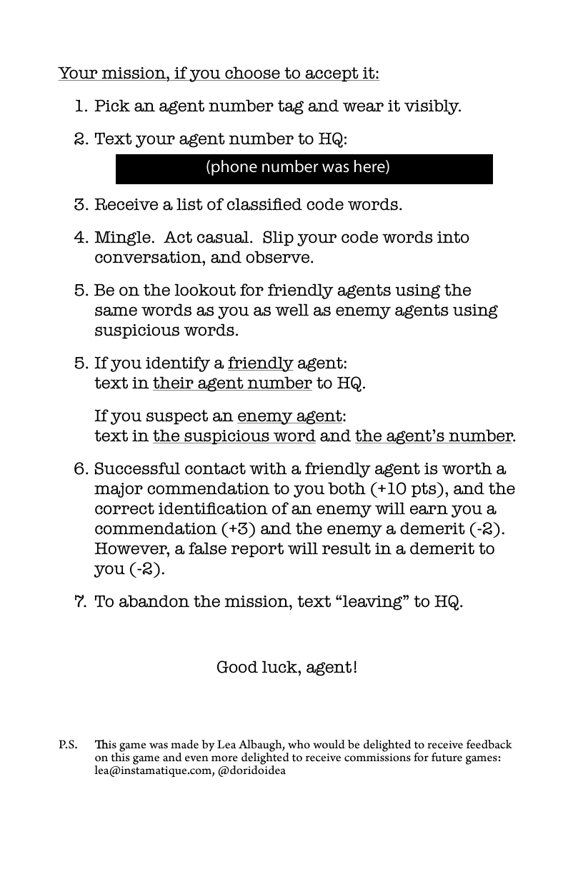But the rules needed a rewrite: the original rules weren’t as easy to follow as I’d hoped, and they were written for a small group of close friends, not a larger group of probable strangers. Trying to remember a list of agent identities is much easier with a small group size, and the direct texting mechanic in particular would work best for people who could make guesses about which friend they were talking to. (Also, direct texting has potential for creepiness with strangers.) And I wanted rules that would work better with people dropping in and out.