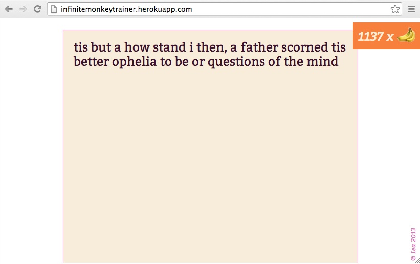A mechanism by which we can use operant conditioning to train the infinite monkeys from the classic thought experiment to generate Hamlet in a more timely manner. Players are rewarded with bananas when the text they type more closely matches Hamlet, as determined using natural language processing techniques. Play online at http://infinitemonkeytrainer.herokuapp.com/ and view the code on Github.