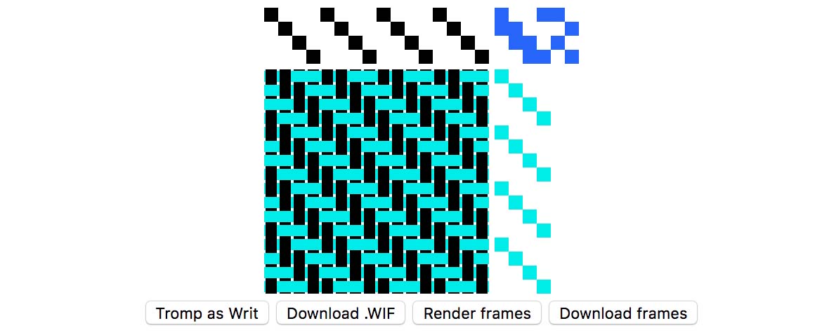 A little client-side loom simulator and generator to accompany my 2018 Strange Loop talk, ‘It’s Just Matrix Multiplication’: Notation For Weaving. The heddle frames generated can be cut out of cardboard or acrylic and used in any kind of shoebox or backstrap loom, as shown in the included video on building a shoebox loom. View the repo on Github, or visit a live demo.