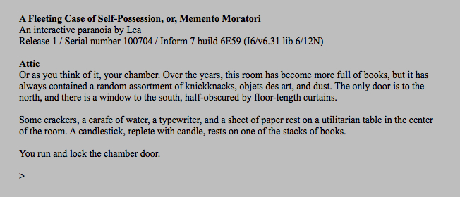 A Fleeting Case of Self-Possession, or, Memento Moratori is a work of parsered interactive fiction that won third place in the 2010 IntroComp, a competition for short introductions to ostensible longer works of interactive fiction. More information can be found at its IFWiki page, or you can read a pair of charming tweets from an internet stranger here and here.
